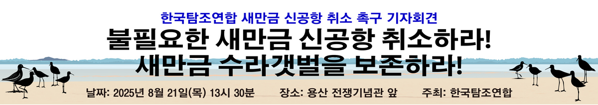 야생조류 관찰과 보호 활동을 하는 전국 탐조인들의 협의체 한국탐조연합을 비롯해 전국 60여 자연·환경 시민단체와 활동가, 시민들이 정부(국토교통부-한국공항공사)의 새만금 신공항 추진 사업에 심각한 우려를 표명하며 사업 철회를 촉구하고 나섰다.