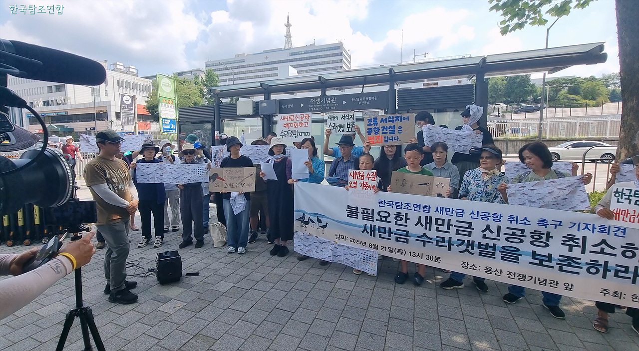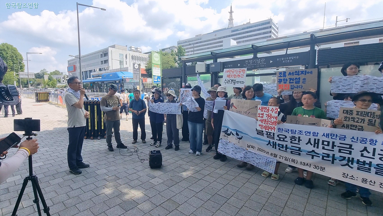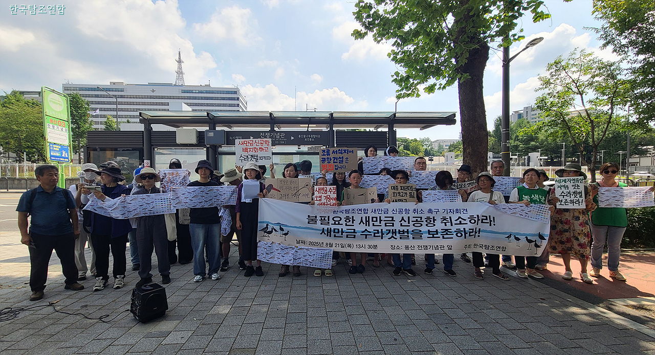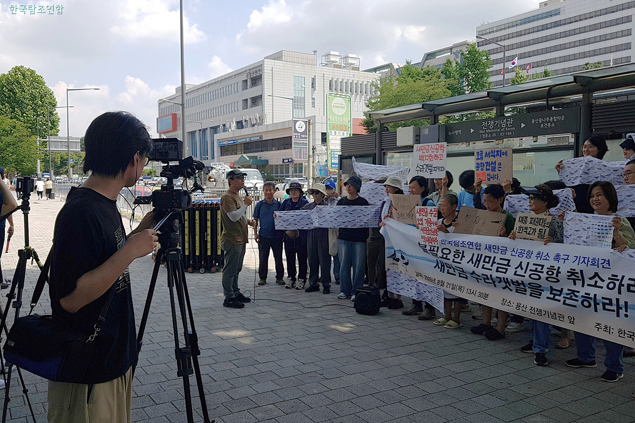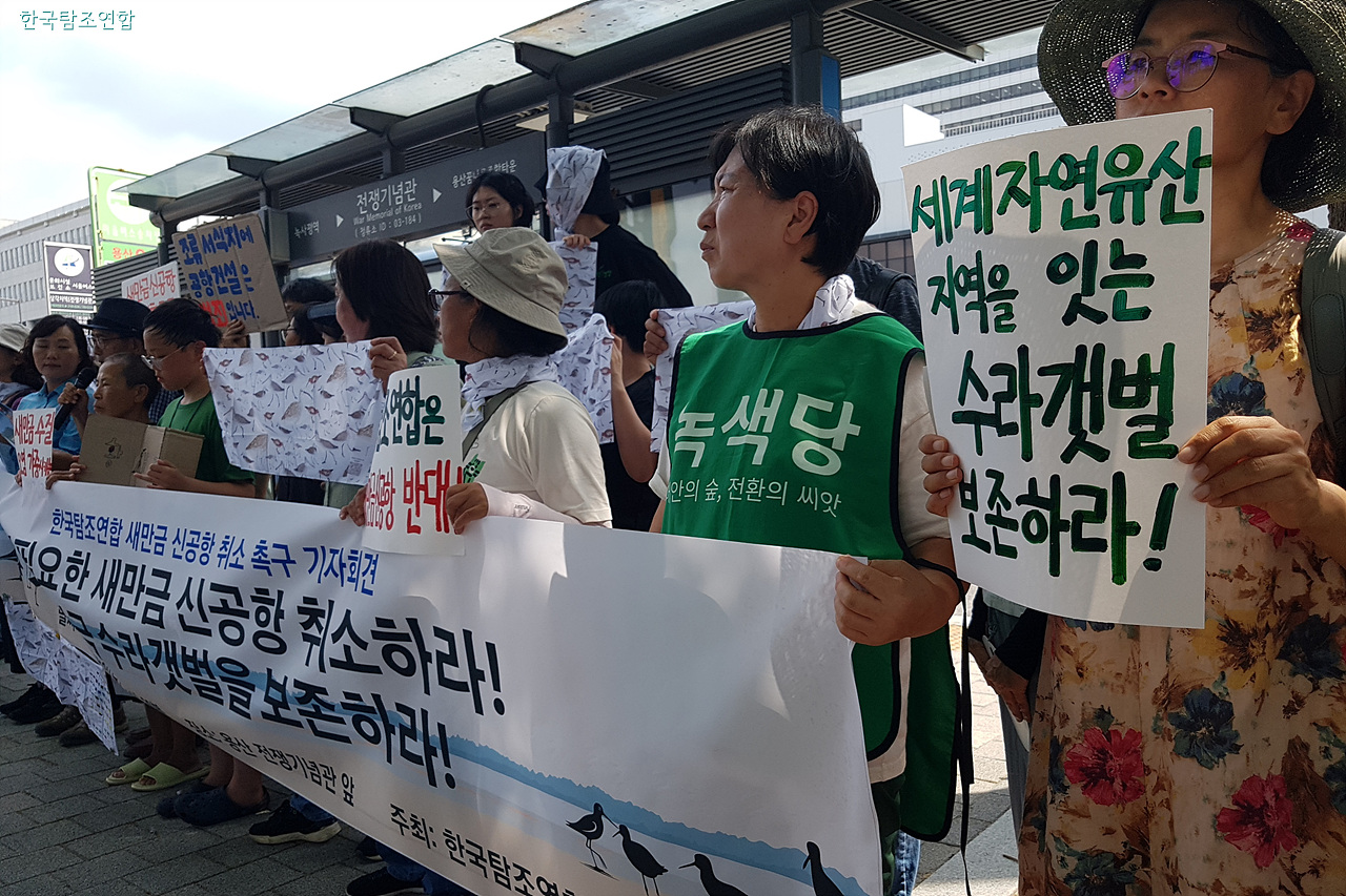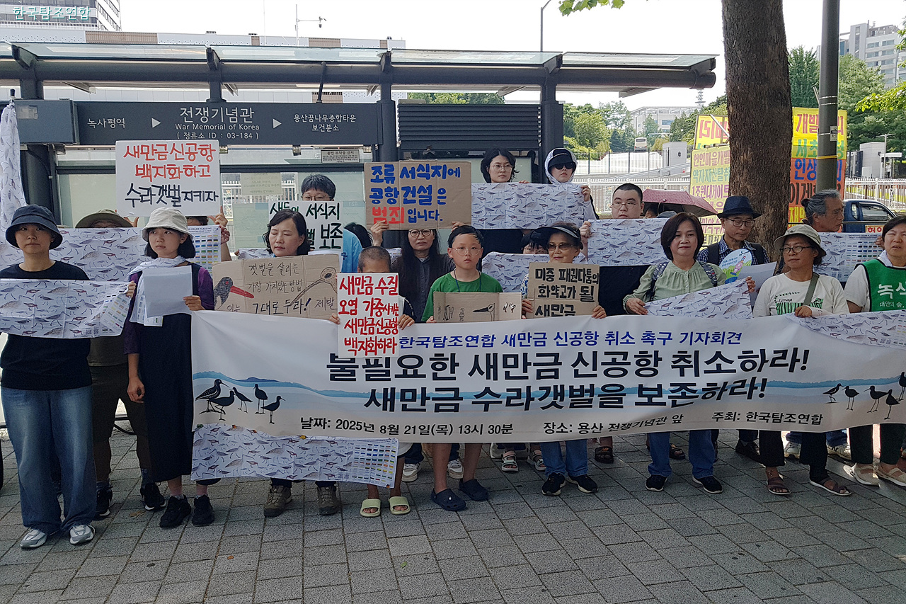 이들은 21일 오후 서울 용산 전쟁기념관 정문 앞에서 기자회견을 열고 정부의 새만금 신공항 건설 계획은 새만금에 마지막 남은 생태 공간 수라갯벌을 회복 불가능할 지경으로 파괴할 뿐 아니라 항공기의 조류 충돌 위험까지 높인다면서 전면적인 사업 철회를 촉구하는 성명을 발표했다.